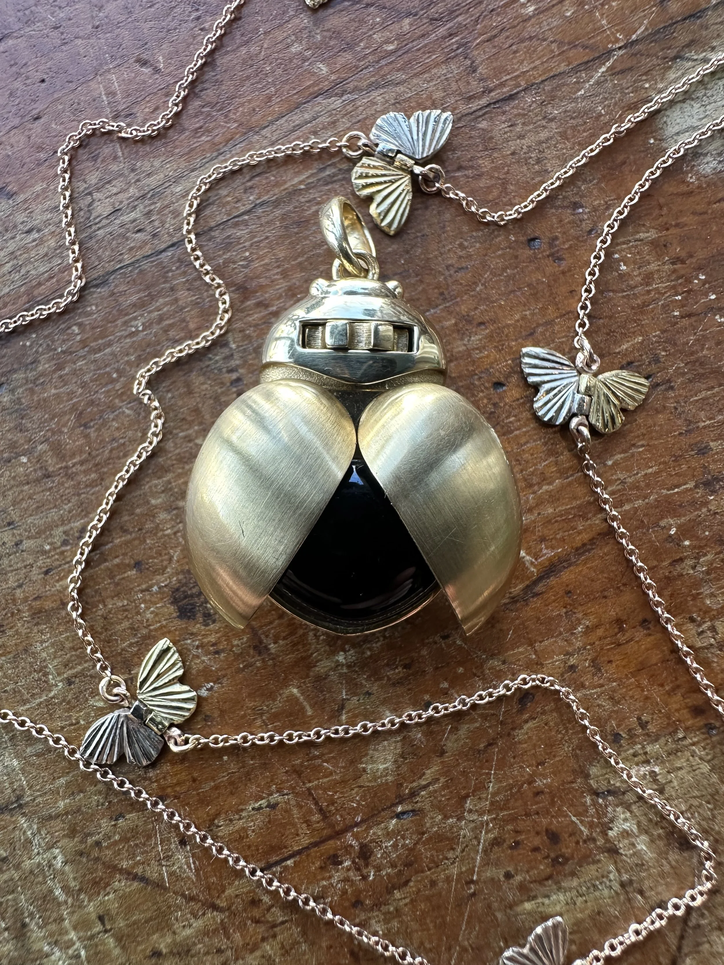 Some of the most recognizable pieces we have in the store are created with their own special inlay process - the butterflies in particular where a frame is created and almost like a puzzle, various metals are carefully set into negative spaces to create our unique butterflies.